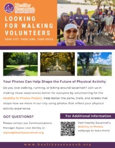 (SAVANNAH, GA) Healthy Savannah is excited to announce a new initiative to engage residents in highlighting and improving the city’s sidewalks, parks, and trails. The Mobility in Photos Project invites community members to share stories about their neighborhood parks and help identify areas that may need attention, such as broken sidewalks, overgrown walking trails, and neglected bike paths, by documenting their experiences and suggestions through a public online survey.
